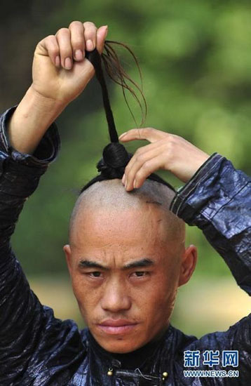 Men in Basha go to great pains to maintain their distinctive hairstyle. It is achieved by shaving off all hair other than that on the top of the head with a sickle and coiling it into a chignon, or “hugun,” as it is called in the Miao language. Legend has it that this distinct characteristic is the legacy of Chi You, a mythical warrior from ancient times and ancestor of the Miao ethnic group. By the time they can speak, all Miao boys know that their “hugun” signifies masculinity and strength. Men consequently wear them for life, and have done so for generations. Those we saw, however, all wore head scarves. We understood that only children taking part in folk performances openly display their “hugun.”