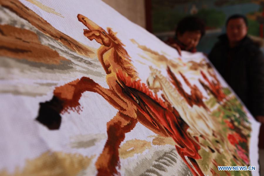 Huo Yuexia (L) demonstrates the 250-centimeter-long cross-stitch work of "Win Success Immediately Upon Arrival" at Xigaogu Village of Yongnian County in Handan City, north China's Hebei Province, Jan. 12, 2014. Huo spent ten months to finish the cross-stitch. In China's ancient times, riding horse is an important mean of transportation. Therefore, Chinese like to use the horse to express their wish that "you will succeed since your arrival". (Xinhua/Hu Gaolei)