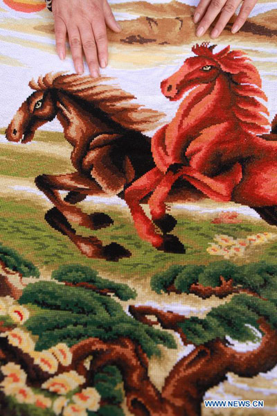 Huo Yuexia demonstrates the 250-centimeter-long cross-stitch work of "Win Success Immediately Upon Arrival" at Xigaogu Village of Yongnian County in Handan City, north China's Hebei Province, Jan. 12, 2014. Huo spent ten months to finish the cross-stitch. In China's ancient times, riding horse is an important mean of transportation. Therefore, Chinese like to use the horse to express their wish that "you will succeed since your arrival". (Xinhua/Hu Gaolei)