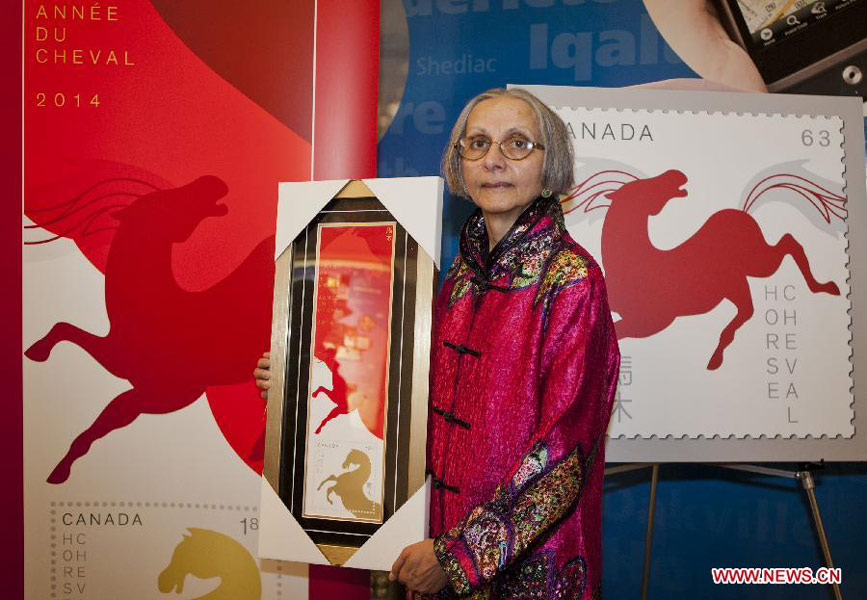 Stamp collector Baljit Sadhu shows her collectible of the Year of the Horse at a post office in Toronto, Jan. 13, 2014. Canada Post issued the Year of the Horse domestic and international rate stamps and collectibles on Monday in celebration of the upcoming Chinese Lunar Year of the Horse. (Xinhua/Zou Zheng)