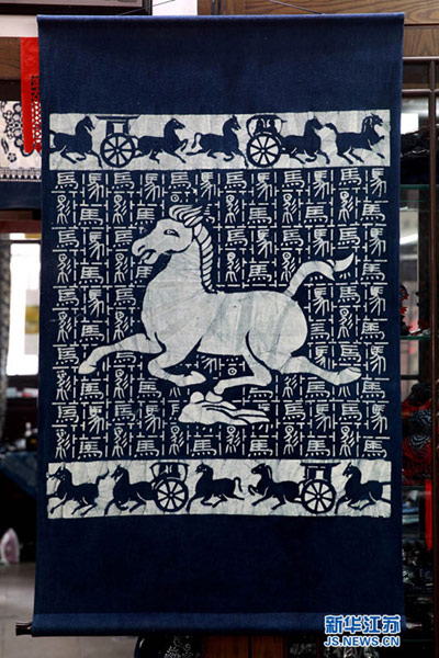 A wall-hanging art piece titled "Galloping" shows a white horse in mid-stride set on an indigo-colored background at the Nantong Museum of Blue Calico on Jan. 10, 2014, in Jiangsu Province. The museum's curator, Wu Yuanxing, and his team made various horse-themed artwork to commemorate the coming new year on the Chinese lunar calendar, which will be the Year of the Horse. [Photo: JS.NEWS.cn]