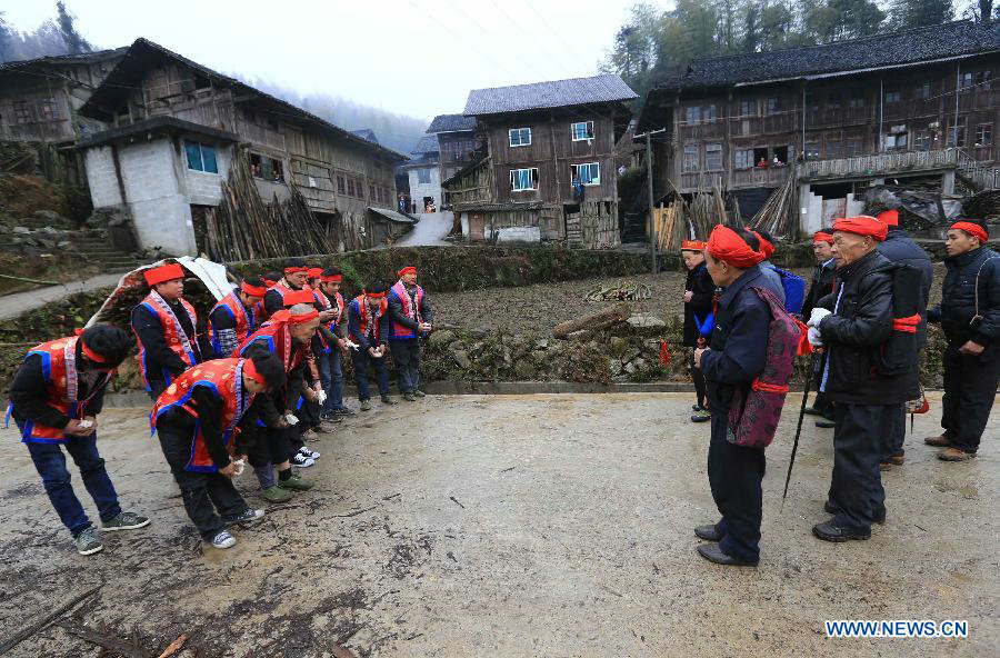 Teachers and students partaking in theDujieceremony pose for a group photo, in the Tonglian Village of the Tonglian Yao Township, in Rongshui Miao autonomous county, south China's Guangxi Zhuang autonomous region, Jan. 14, 2014.