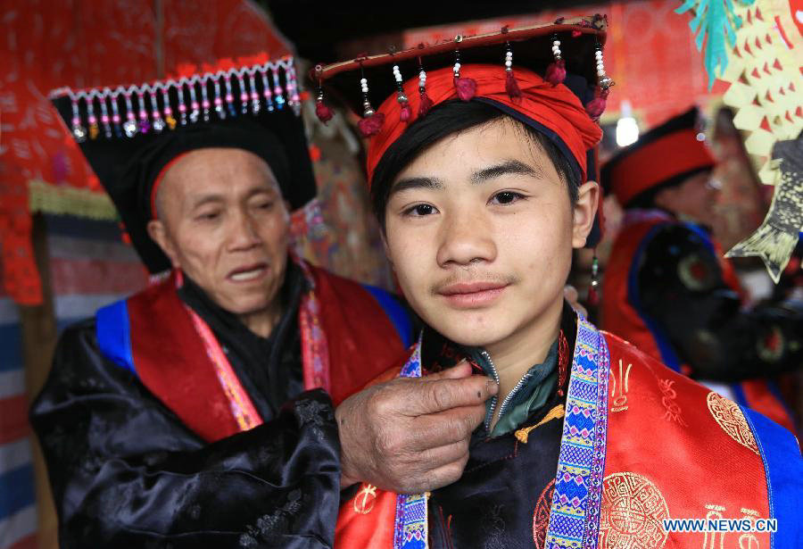 Teachers and students partaking in theDujieceremony pose for a group photo, in the Tonglian Village of the Tonglian Yao Township, in Rongshui Miao autonomous county, south China's Guangxi Zhuang autonomous region, Jan. 14, 2014.