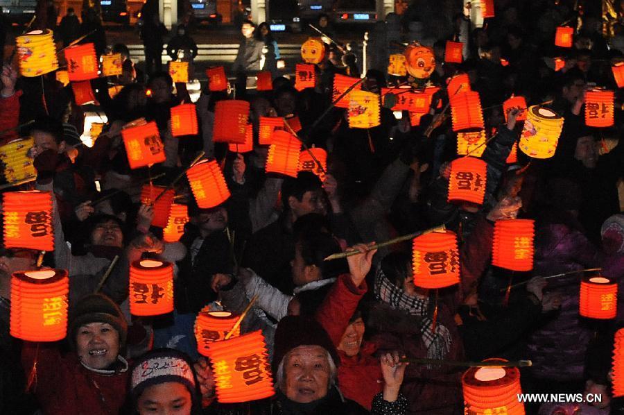 Photo taken on Feb. 1, 2011 shows people carrying lanterns with the Chinese character "fu" on them during a spring festival lantern festival in Zhengzhou city, capital of central China's Henan province. The Chinese Character "fu", which means "good luck", is common everywhere across China during the Spring Festival. It is popularfor its propitious meaning, also can be interpreted as "happiness",which the Chinese people believe will give them blessing in thecoming new year. (Xinhua/Wang Song)