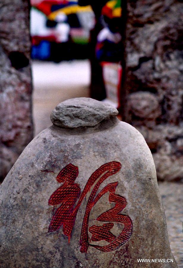 Photo taken on May 23, 2002 shows a stele with the Chinese character "fu" on it in a scenery spot in south China's Hainan province. The Chinese Character "fu", which means "good luck", is common everywhere across China during the Spring Festival. It is popular for its propitious meaning, also can be interpreted as "happiness", which the Chinese people believe will give them blessing in the comingnew year. (Xinhua/Wang Song)