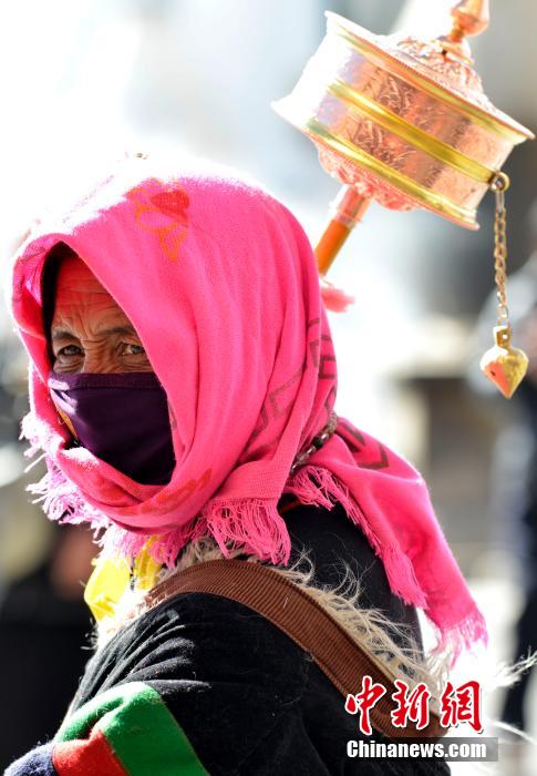 On Jan. 19, a believer holds a big prayer wheel. (Photo/Chinanews.com) |