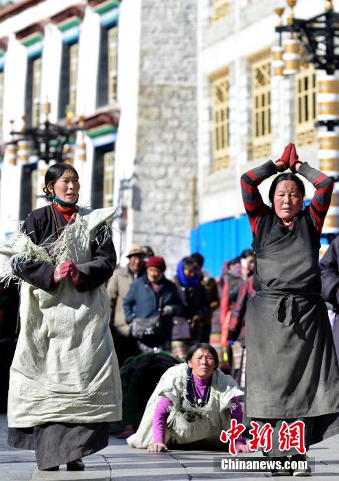 On Jan. 19, believers kowtow on their way to worship the Buddha in Barkhor Street, Lhasa. (Photo/Chinanews.com) |