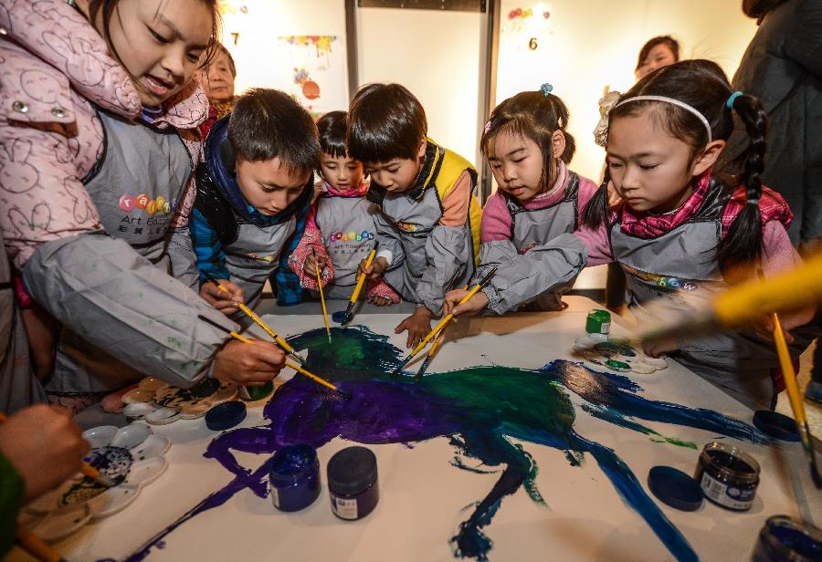 The kids paint a horse with watercolor. (Photo/Xinhua)