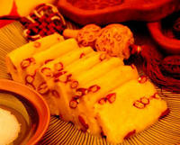 A steaming hot pot (or Chinese fondue) with meat, seafood and vegetables is a must, meaning prosperous and booming.