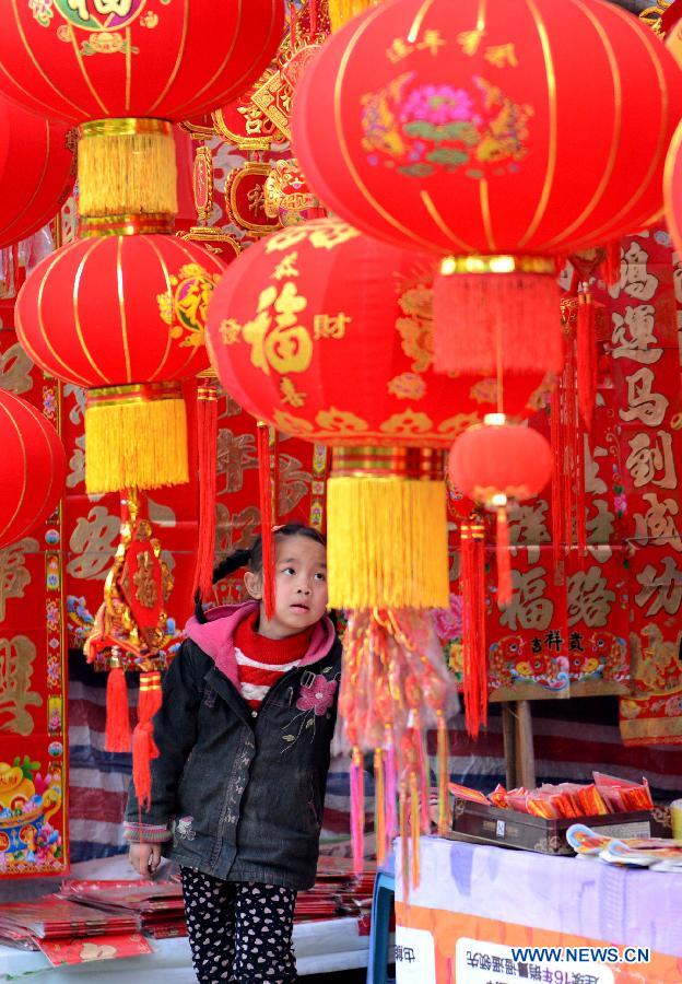 A girl watches spring festival scrolls in a trading center in Wan'an county, east China's Jiangxi province, Jan. 25, 2014. With the Spring Festival approaching, special purchases for the lunar new year with a fair price attracted the Chinese people. (Xinhua/Zhou Ke)