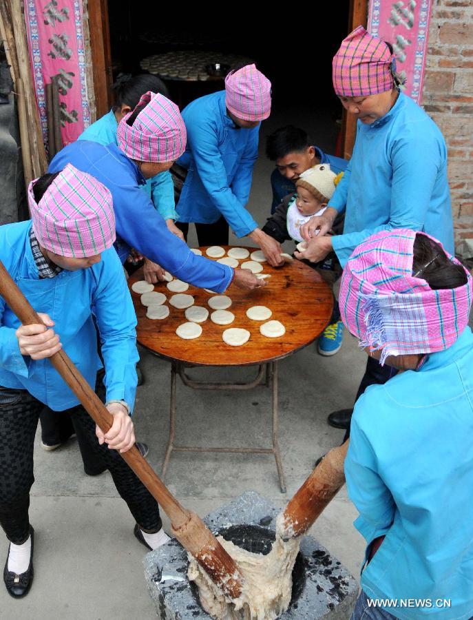 Women of Yao ethnic group make "ciba", a special glutinous rice cake, in Luoshan Village, Lianshan Township, Fuchuan Yao autonomous county, south China's Guangxi Zhuang autonomous region, Jan. 26, 2014. Yao people in Fuchuan have the tradition of making ciba for the Spring Festival and harvest celebration. [Xinhua/Chen Zixia]