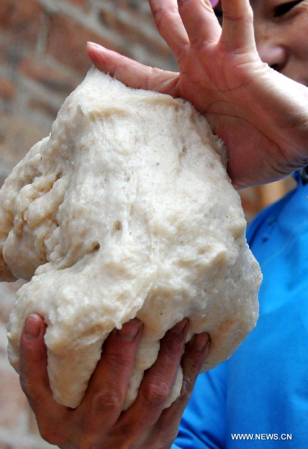 De Chengyin, a villager of Yao ethnic group, makes "ciba", a special glutinous rice cake, in Luoshan Village, Lianshan Township, Fuchuan Yao autonomous county, south China's Guangxi Zhuang autonomous region, Jan. 26, 2014. Yao people in Fuchuan have the tradition of making ciba for the Spring Festival and harvest celebration. [Xinhua/Chen Zixia]