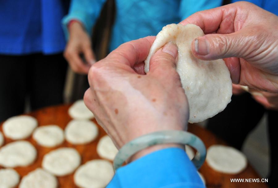 A woman of Yao ethnic group makes "ciba", a special glutinous rice cake, in Luoshan Village, Lianshan Township, Fuchuan Yao autonomous county, south China's Guangxi Zhuang autonomous region, Jan. 26, 2014. Yao people in Fuchuan have the tradition of making ciba for the Spring Festival and harvest celebration. [Xinhua/Chen Zixia]