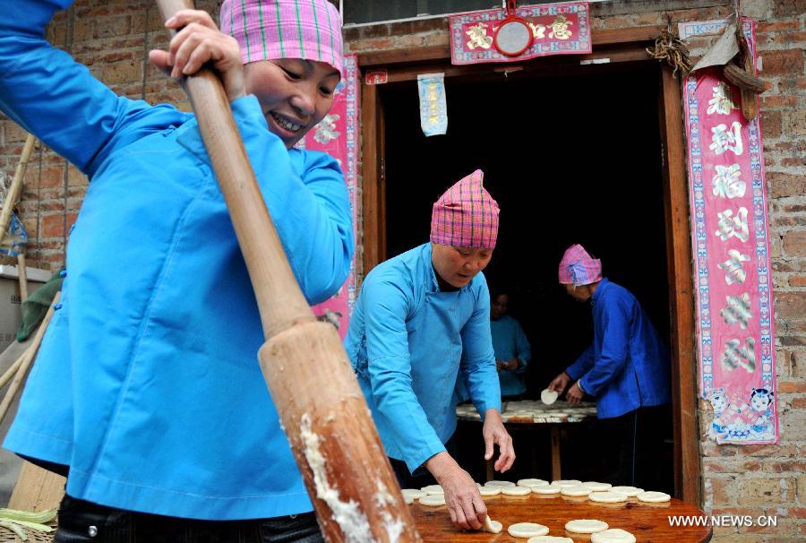 Women of Yao ethnic group make "ciba", a special glutinous rice cake, in Luoshan Village, Lianshan Township, Fuchuan Yao autonomous county, south China's Guangxi Zhuang autonomous region, Jan. 26, 2014. Yao people in Fuchuan have the tradition of making ciba for the Spring Festival and harvest celebration. [Xinhua/Chen Zixia]