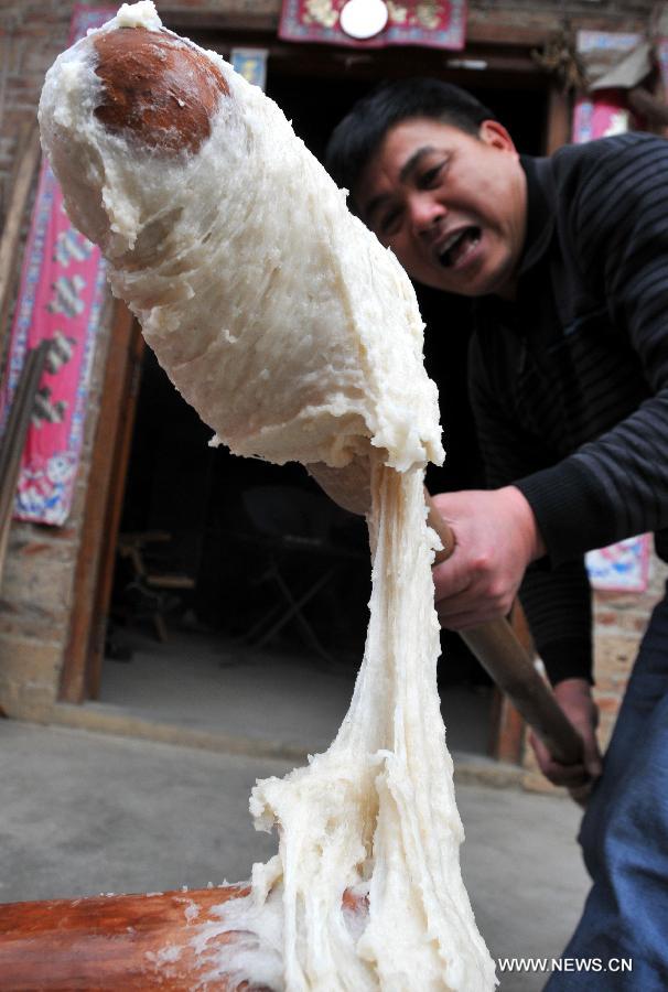 Xia Changxun, a villager of Yao ethnic group, pestles braised glutinous rice to make "ciba", a kind of rice cake, in Luoshan Village, Lianshan Township, Fuchuan Yao autonomous county, south China's Guangxi Zhuang autonomous region, Jan. 26, 2014. Yao people in Fuchuan have the tradition of making ciba for the Spring Festival and harvest celebration. [Xinhua/Chen Zixia]