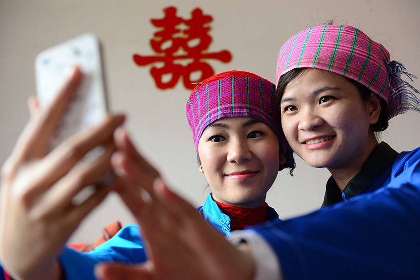 Nie Changying (left) takes selfies with her bridesmaid in Wujiazhai Village, Gucheng Town, Fuchuan Yao Autonomous County, Guangxi Zhuang Autonomous Region, Jan. 25, 2014. (Xinhua/Chen Zixia) |