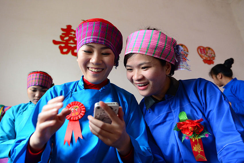 Nie Changying (left) shares her wedding process through Wechat, and gets dozens of replies in a few minutes, Wujiazhai Village, Gucheng Town, Fuchuan Yao Autonomous County, Guangxi Zhuang Autonomous Region, Jan. 25, 2014. (Xinhua/Chen Zixia)