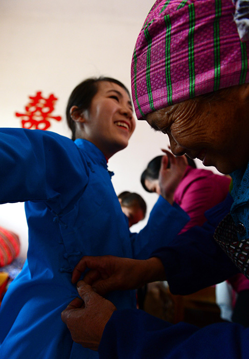 The bride Nie Changying (left) puts on traditional ethnic dress in Wujiazhai Village, Gucheng Town, Fuchuan Yao Autonomous County, Guangxi Zhuang Autonomous Region, Jan. 25, 2014. (Xinhua/Chen Zixia)