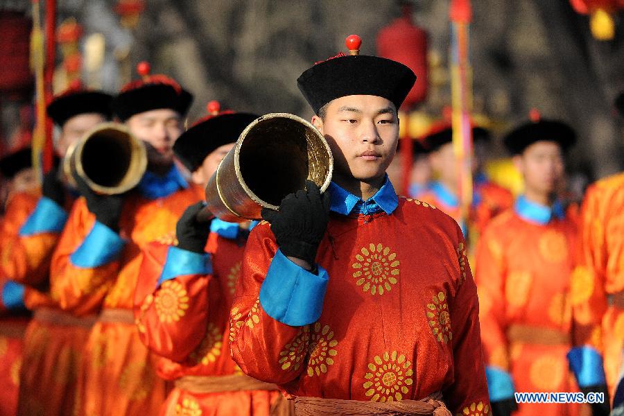Performers wearing costumes rehearse for a performance presenting the ancient royal heaven worship ceremony in the Temple of Heaven in Beijing, capital of China, Jan. 28, 2014. The Temple of Heaven, first built in 1420 and used to be the imperial sacrificial altar during the Ming (1368-1644) and Qing (1644-1911) dynasties, will hold the ancient royal ritual for the worship of the heaven for visitors during the Spring Festival. (Xinhua/He Junchang)