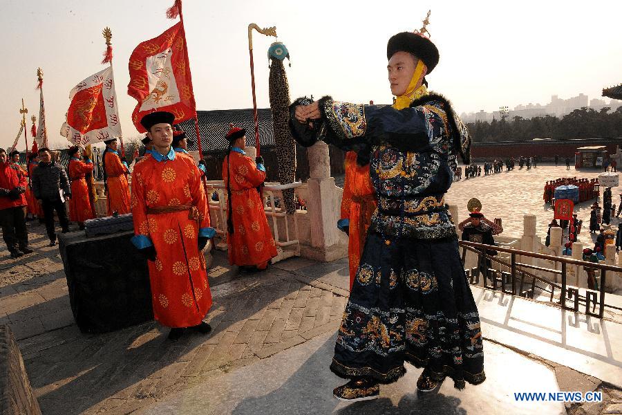 Performers wearing costumes rehearse for a performance presenting the ancient royal heaven worship ceremony in the Temple of Heaven in Beijing, capital of China, Jan. 28, 2014. The Temple of Heaven, first built in 1420 and used to be the imperial sacrificial altar during the Ming (1368-1644) and Qing (1644-1911) dynasties, will hold the ancient royal ritual for the worship of the heaven for visitors during the Spring Festival. (Xinhua/He Junchang)
