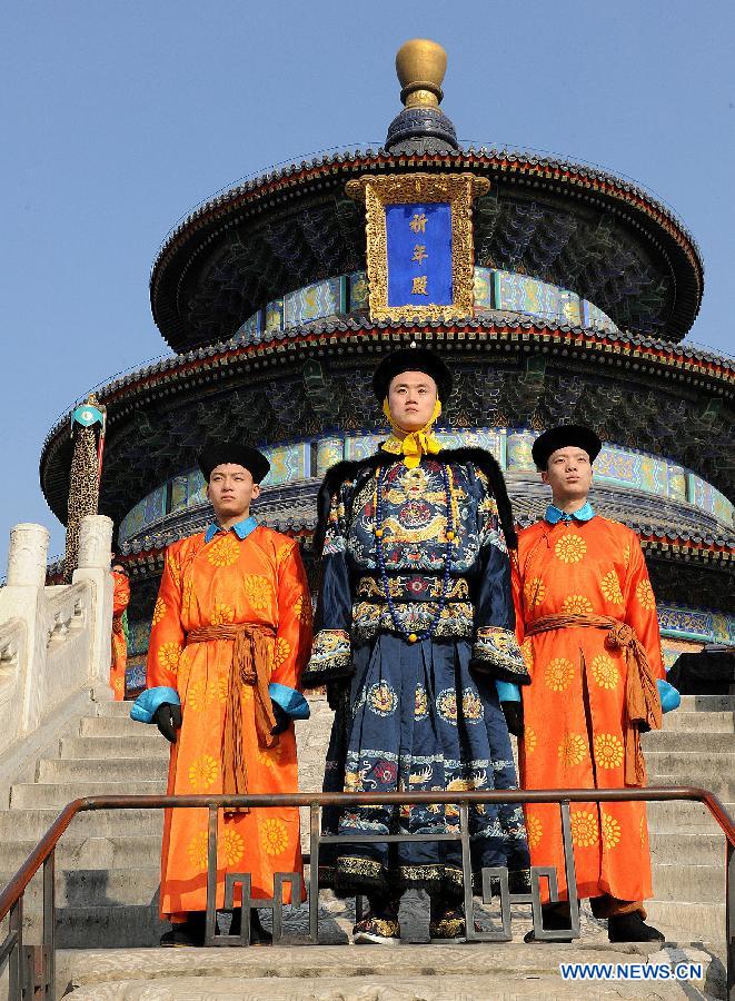 Performers wearing costumes rehearse for a performance presenting the ancient royal heaven worship ceremony in the Temple of Heaven in Beijing, capital of China, Jan. 28, 2014. The Temple of Heaven, first built in 1420 and used to be the imperial sacrificial altar during the Ming (1368-1644) and Qing (1644-1911) dynasties, will hold the ancient royal ritual for the worship of the heaven for visitors during the Spring Festival. (Xinhua/He Junchang)
