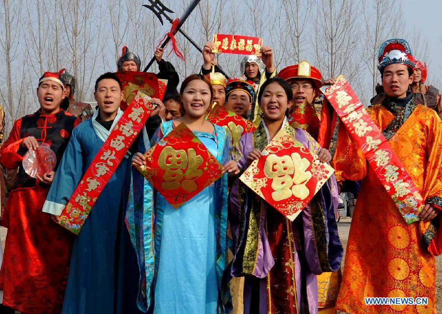 Workers dressed in traditional attires show the Spring Festival couplets and paper cuts in Zhengzhou, capital of center China's Henan province, Jan. 28, 2014. Many folk traditions, such as sticking paper cuts and making flowery buns, were displayed at a folk temple fair in Zhengzhou to celebrate the upcoming Spring Festival. (Xinhua/Li An)