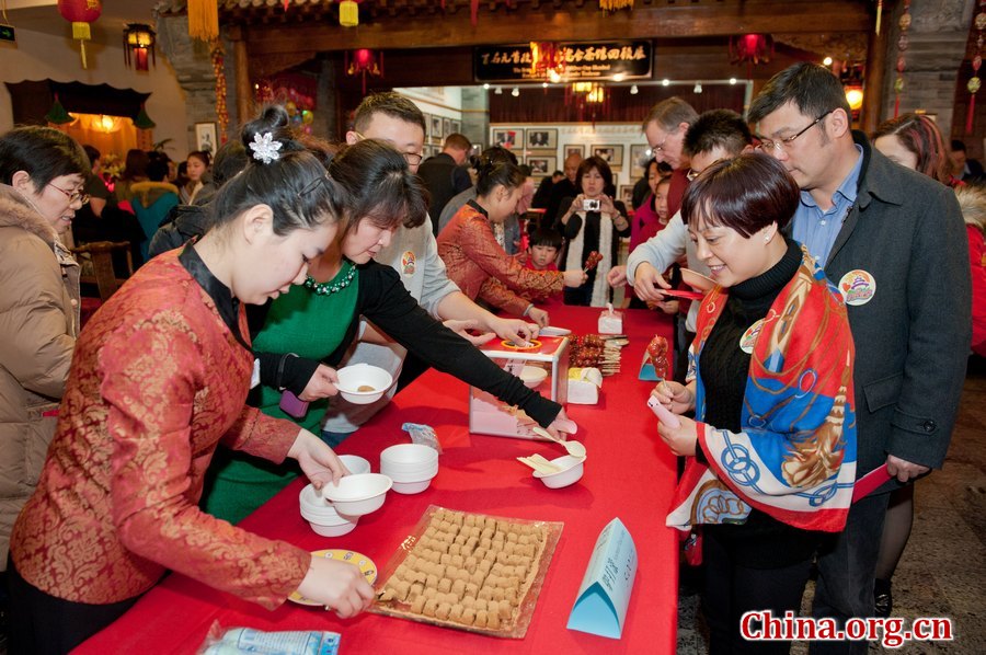 With China's Year of the Horse soon to gallop in, Beijing Monthly together with the Beijing International Culture Association on January 26 hosted the "Experience Beijing - Temple Festival during Chinese New Year" affair at Qianmen's Laoshe Teahouse as part of the "Beijing Salon - Experience Beijing" event series. The activity intended to give non-Beijingers, both foreign and Chinese this time around, a snap bite of the city's traditional culture. A Beijing Opera performance, a time-honored tea ceremony and a tasting of local snacks hailing from the nation's former imperial court kitchens all set out to cater visitors with your typical Chinese New Year's atmosphere. [Photo: China.org.cn/Chen Boyuan]