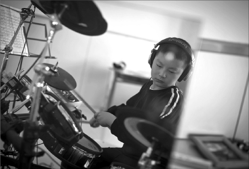 Chao Chao, a fourth-grader with autism, practices electronic drums for a performance at Beijing Guomei Jiayuan Primary School.