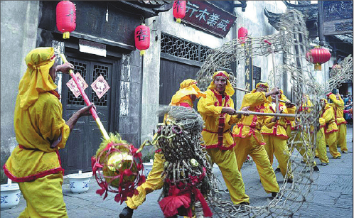 The straw dragon dance is a traditional routine in the province's ancient city Hongjiang.