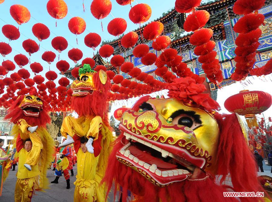 Actors perform lion dance at the temple fair in Ditan Park in Beijing, capital of China, Jan. 30, 2014. The 29th Ditan Park temple fair open to the public on Thursday. [Photo/Xinhua]