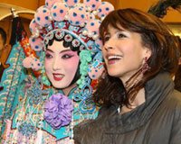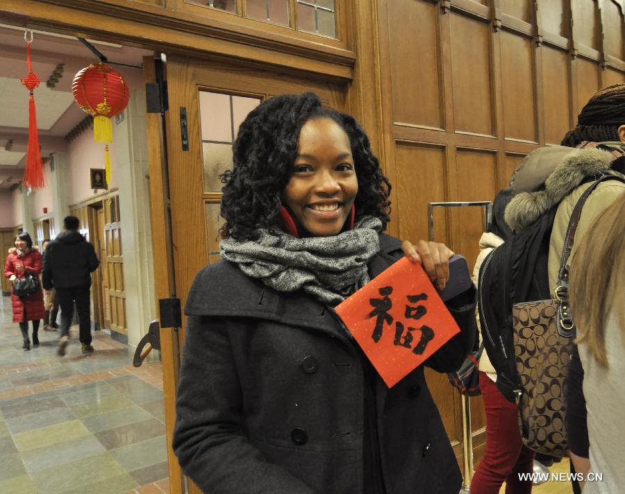 An American student shows a blessing sticker with Chinese character "Fu", meaning good luck, during an activity celebrating Chinese Lunar New Year at the Confucius Institute of Purdue University in West Lafayette, Indiana, the United States, Jan. 29, 2014.[Photo/Xinhua]