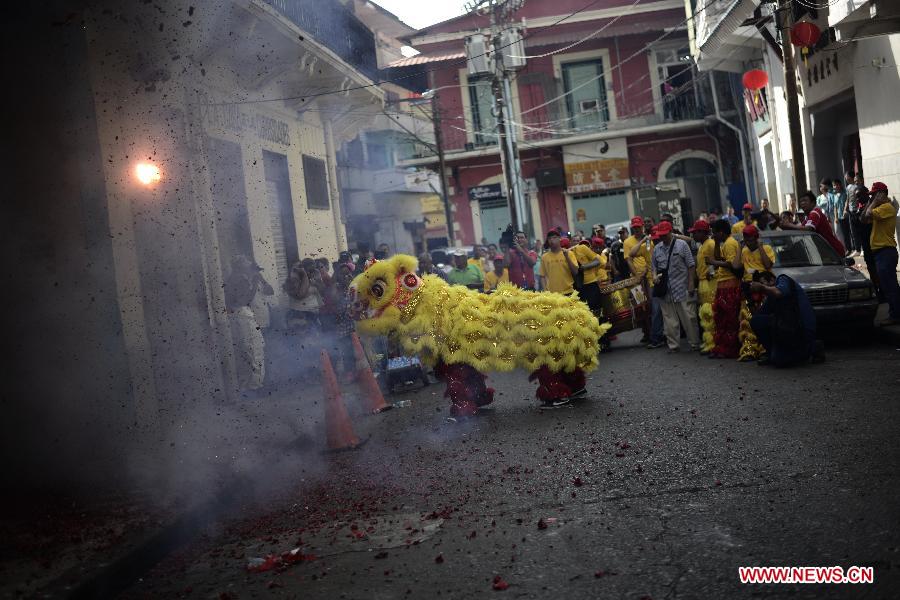 Members of a dance group perform the lion dance during the Chinese Lunar New Year celebration, in Panama City, capital of Panama, on Jan. 31, 2014. [Photo/Xinhua]
