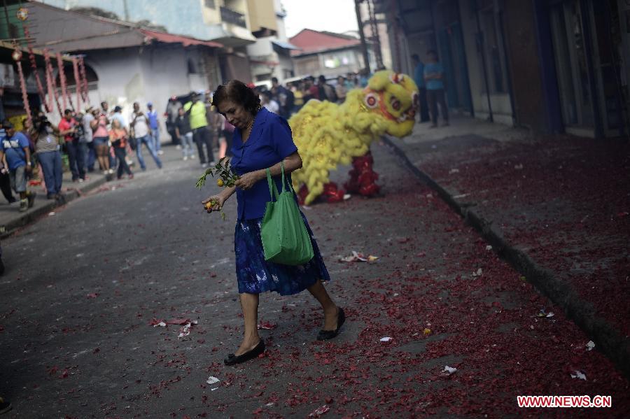 Members of a dance group perform the lion dance during the Chinese Lunar New Year celebration, in Panama City, capital of Panama, on Jan. 31, 2014. [Photo/Xinhua]