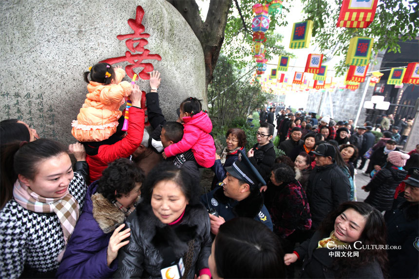 Tourists at Wuhou Temple Fair, in Chengdu , Sichuan province, touch the Chinese character "xi," which means "happiness," to pray for good blessings in the year to come.[Photo/chinaculture.org]