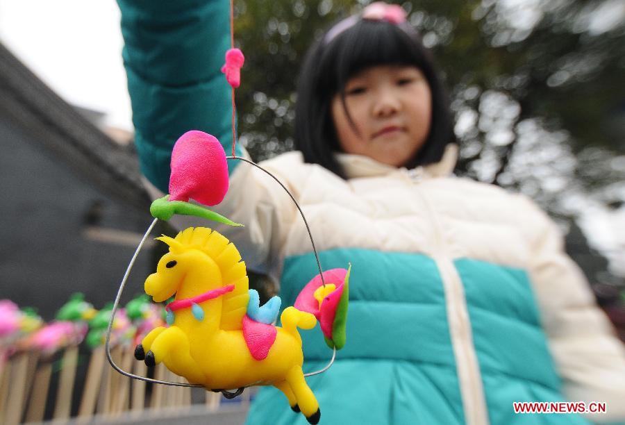 A young girl shows her horse-shaped dough figurine during a temple fair to celebrate the Spring Festival, or the Chinese Lunar New Year, in Qingdao, east China's Shandong province, Jan. 31, 2014. The Spring Festival this year marks the beginning of the Year of the Horse, according to the Chinese zodiac that assigns one of 12 animals, either real or mythological, to each year. [Xinhua/Wang Haibin]