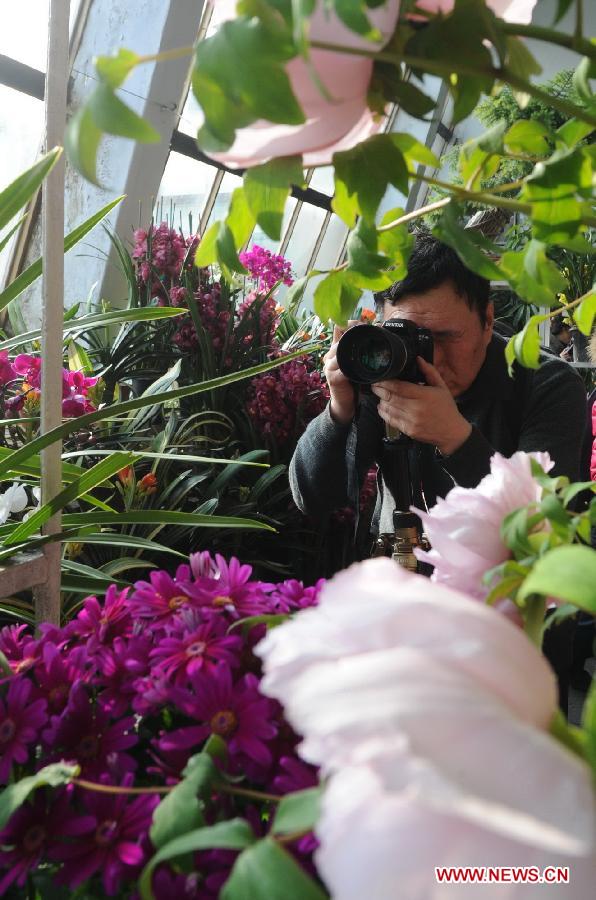 A man takes pictures of flowers displayed at a flower show to celebrate the Spring Festival, or the Chinese Lunar New Year, in Changchun, capital of northeast China's Jilin province, Feb. 1, 2014. Many local residents come to the flower show on the second day of the seven-day break for Spring Festival. [Xinhua/Zhang Nan]
