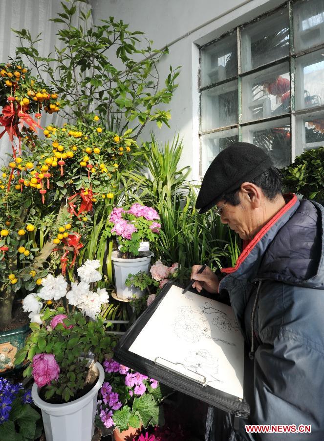 A man draws flowers at a flower show to celebrate the Spring Festival, or the Chinese Lunar New Year, in Changchun, capital of northeast China's Jilin province, Feb. 1, 2014. Many local residents come to the flower show on the second day of the seven-day break for Spring Festival. [Xinhua/Zhang Nan]