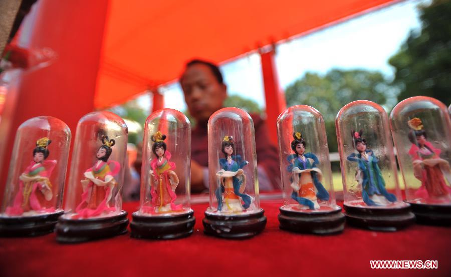 A folk artist makes dough figures at a temple fair to celebrate the Spring Festival, or the Chinese Lunar New Year, in Nanning, capital of south China's Guangxi Zhuang autonomous region, Feb. 1, 2014. Intangible cultural heritages like shadow play and paper cutting attracted lots of people to the temple fair on Saturday, the second day of the seven-day break for Spring Festival. [Xinhua/Lu Boan]