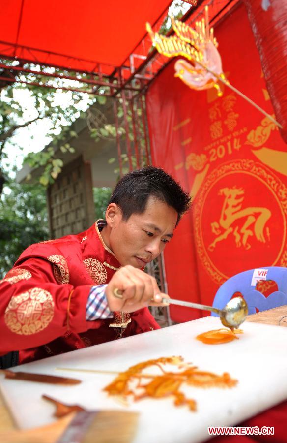 A folk artist makes sugar art at a temple fair to celebrate the Spring Festival, or the Chinese Lunar New Year, in Nanning, capital of south China's Guangxi Zhuang autonomous region, Feb. 1, 2014. Intangible cultural heritages like shadow play and paper cutting attracted lots of people to the temple fair on Saturday, the second day of the seven-day break for Spring Festival. [Xinhua/Lu Boan]
