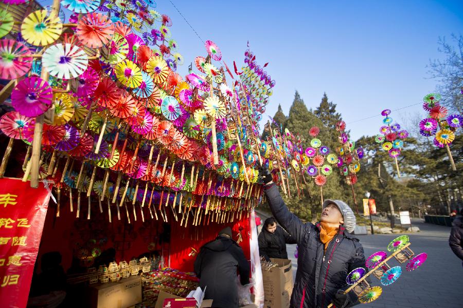 A tourist selects pinwheels at a temple fair in celebration of Chinese lunar new year in Beijing, capital of China, Feb. 2, 2014. [Xinhua/Zhao Bing]