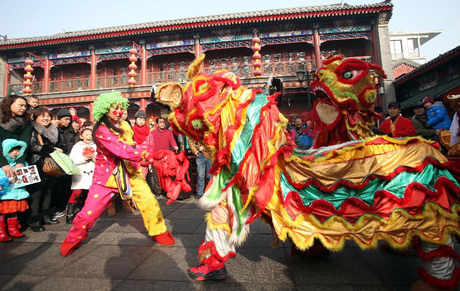 Folk artisans perform lion dance at a temple fair in celebration of Chinese lunar new year in Tianjin, north China, Feb. 2, 2014. [Xinhua/Liu Dongyue]