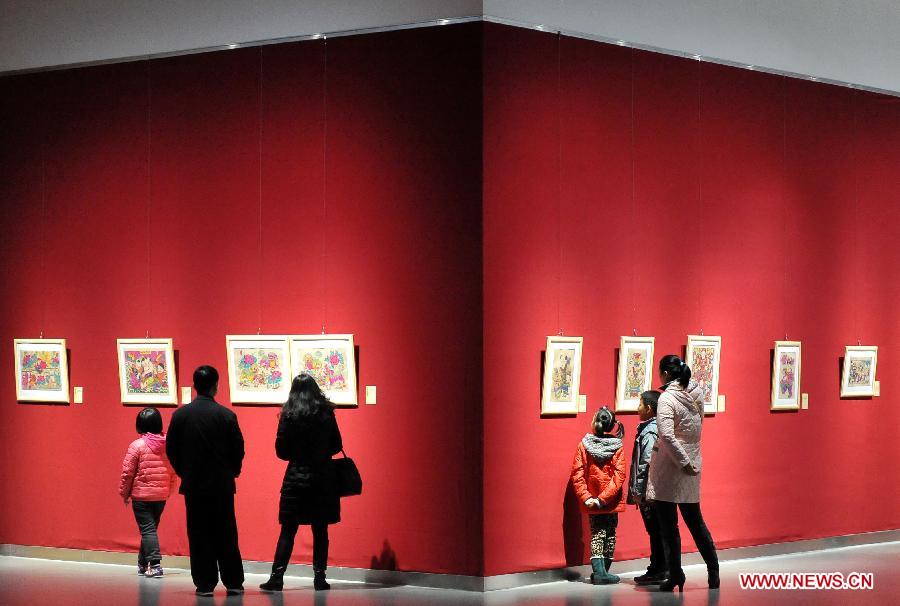 Parents and children look at traditional Lunar New Year's paintings at Shandong Museum in Jinan, capital of east China's Shandong province, Feb. 3, 2014. Many local residents come to the museum on the fourth day of the seven-day break for Spring Festival, or the Chinese Lunar New Year. [Xinhua/Zhu Zheng]