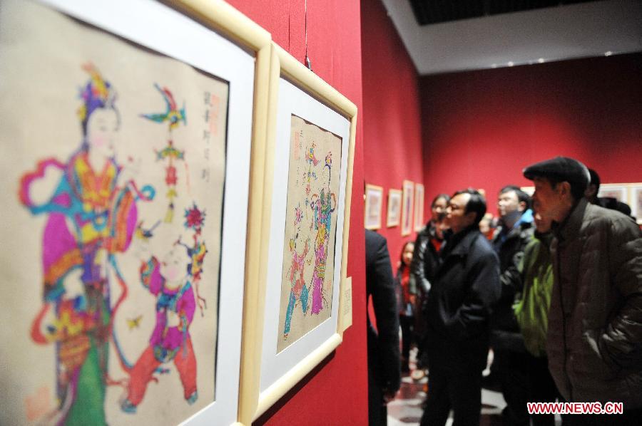 People look at traditional Lunar New Year's paintings at Shandong Museum in Jinan, capital of east China's Shandong province, Feb. 3, 2014. Many local residents come to the museum on the fourth day of the seven-day break for Spring Festival, or the Chinese Lunar New Year. [Xinhua/Zhu Zheng]