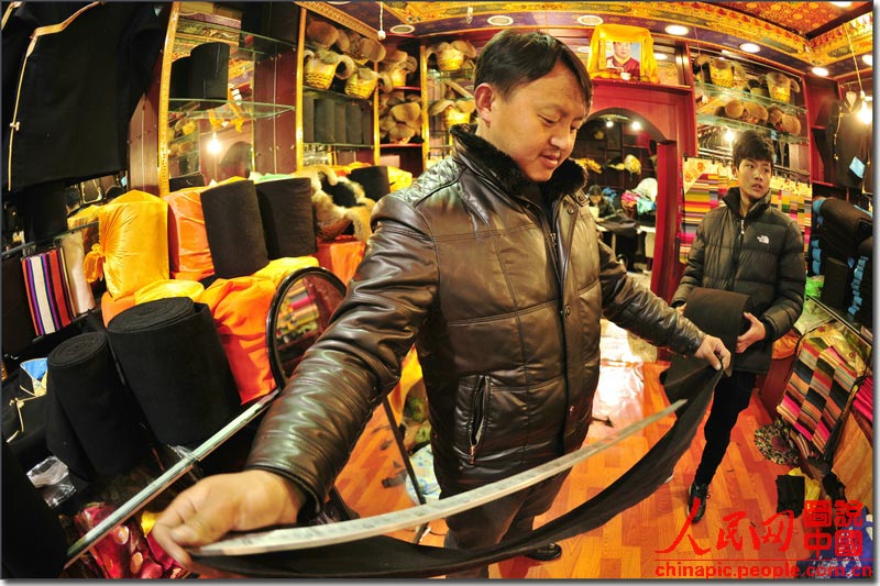Tibetan stylist makes traditional clothing and accessories at the tailor's shop. (Photo source: Chinapic)