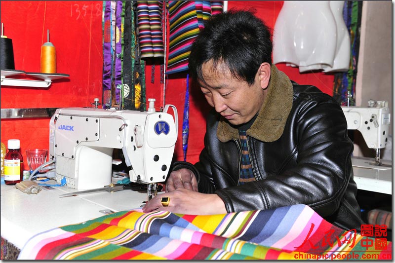 Tibetan stylist makes traditional clothing and accessories at the tailor's shop. (Photo source: Chinapic)