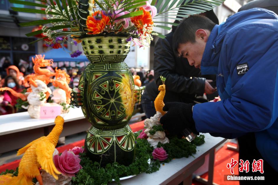 Turnip sculptures are exhibited at the 2014 Turnip Festival in Qingdao, east China’s Shandong province Feb. 8. Over 20 food sculptors from around the country demonstrated their skills at the festival. (Photo/Chinanews.com)