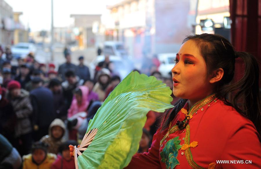 An actress performs Errenzhuan , a noted art form popular in northeastern China, in Horinger County of Hohhot City, north China's Inner Mongolia Autonomous Region, Feb. 11, 2014, during the Spring Festival celebrations.(Xinhua/Ren Junchuan)