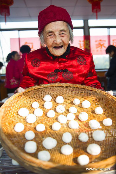 Huang Jingwen, a centenarian, shows the traditional snack Yuanxiao she made with staff members of local community in Hefei, capital of east China's Anhui Province, Feb. 11, 2014, to celebrate the upcoming lantern festival which falls on Feb. 14 this year. Yuanxiao, or glutinous rice flour dumpling with sweetened stuffing, is a traditional food for the Lantern Festival. (Xinhua/Du Yu)