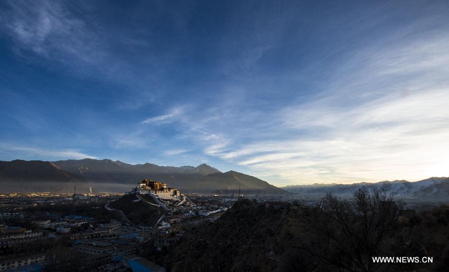 Photo taken on Jan. 14, 2014 from the Chakpori Hill shows a view of the Potala Palace at dawn in Lhasa, capital of southwest China's Tibet Autonomous Region. Known as an ancient palace at high elevation, the Potala Palace was inscribed onto the world cultural heritage list in 1994. (Xinhua/Purbu Zhaxi)