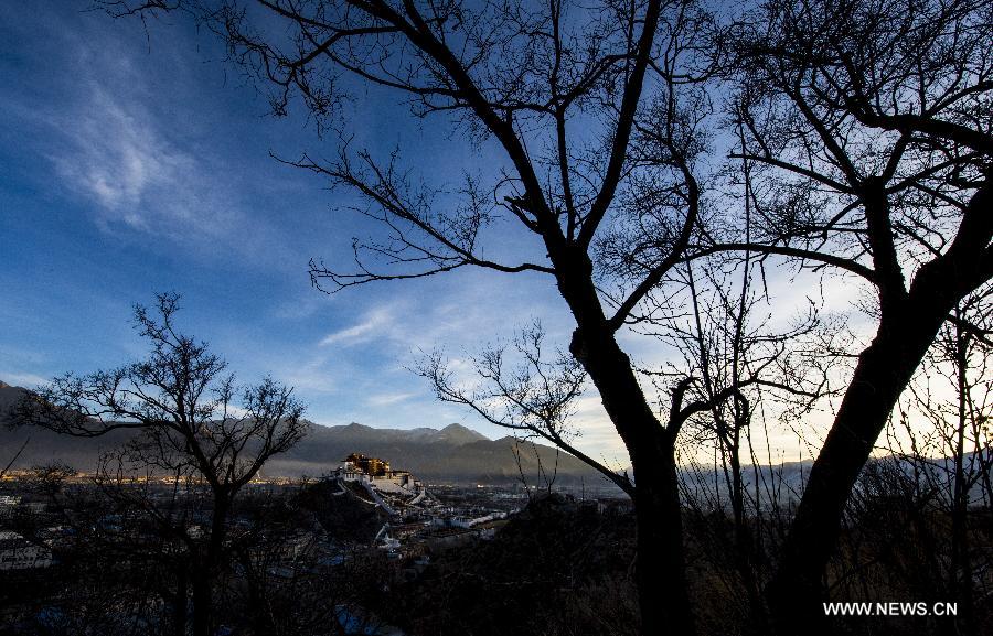 Photo taken on Jan. 14, 2014 from the Chakpori Hill shows a view of the Potala Palace at dawn in Lhasa, capital of southwest China's Tibet Autonomous Region. Known as an ancient palace at high elevation, the Potala Palace was inscribed onto the world cultural heritage list in 1994. (Xinhua/Purbu Zhaxi)